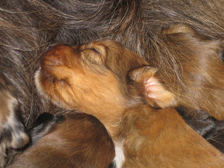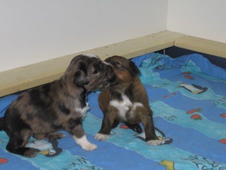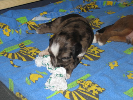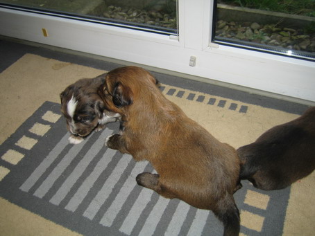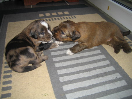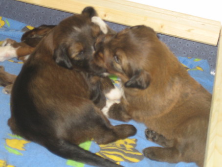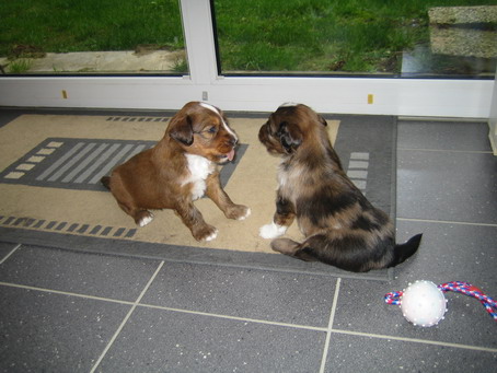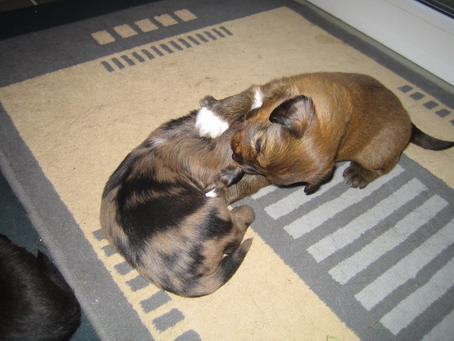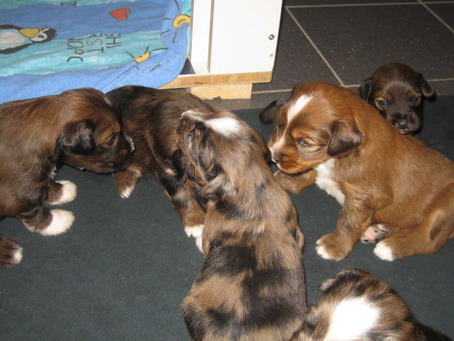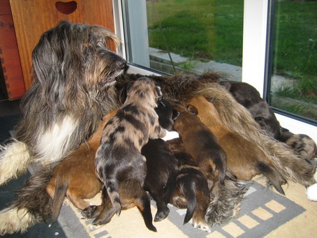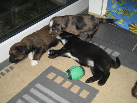 Seit ein paar Tagen bekommen unsere Welpen abends feinstes Tartar zugefüttert. Nach den ersten Anfangsschwierigkeiten spaltet sich die Rasselbande in Gourmets und Piranhas. Gut, daß die Zähnchen noch so winzig sind.