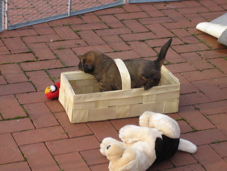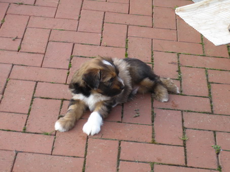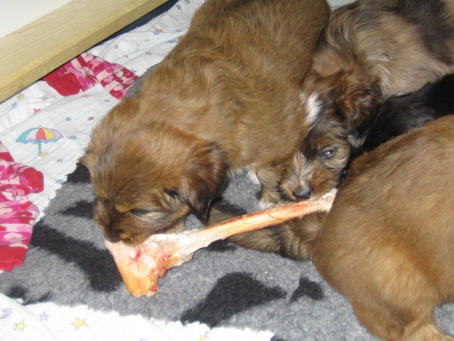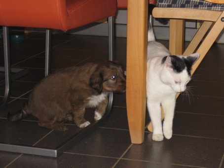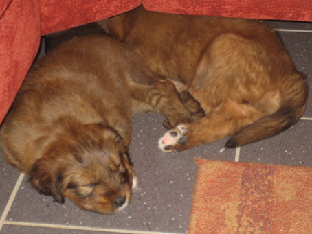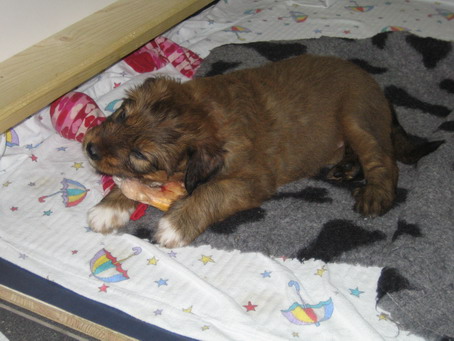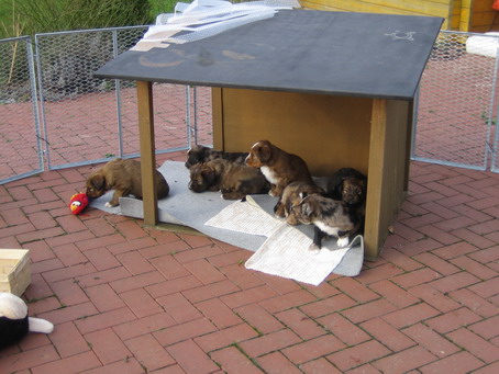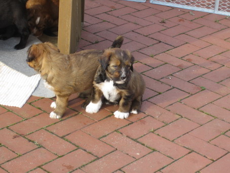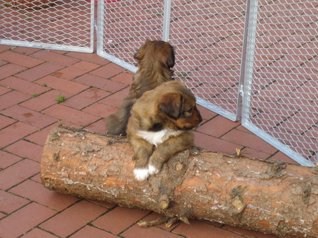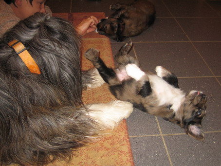 Langsam aber sicher werden die Schlafphasen kürzer und die Wachphasen länger. In den Wachphasen dürfen die Welpen fast immer die ganze Wohnung unsicher machen oder sie kommen raus in den Welpenauslauf. Man muß auf jeden Fall immer aufpassen, wohin man tritt.