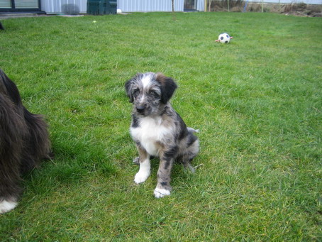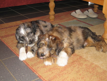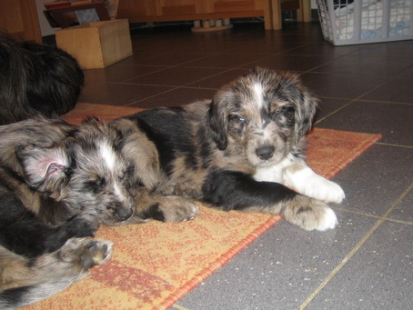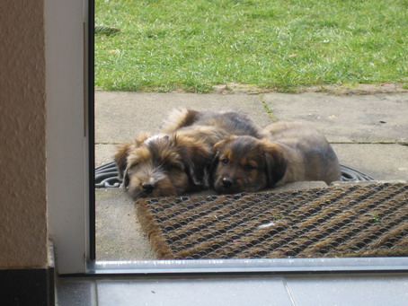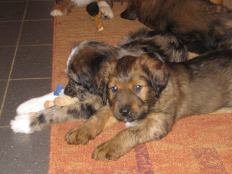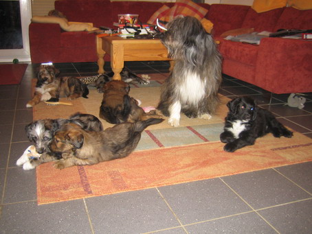 Nun ist noch ein kleiner Welpen-Kindergarten von 4 Welpen bei uns. Gianna wird die nächste sein, die unser Rudel verlässt, kommenden Sonnabend. Eine Woche später ziehen dann Guiseppe und Graziella um. Und wer jetzt richtig aufgepasst hat, hat bemerkt, daß dann noch Grazia über bleibt. Sie wird also Jules Dauergesellschaft werden. Wir werden sie Kaya nennen, da man Grazia nur rufen kann, wenn man stark erkältet ist.