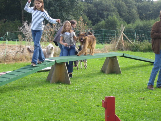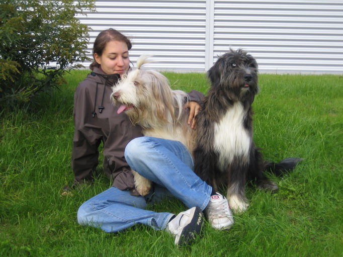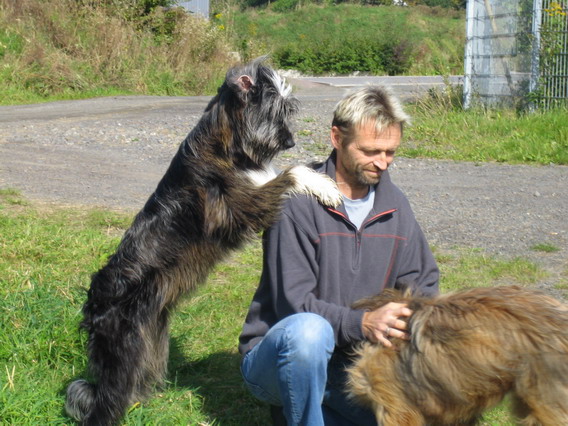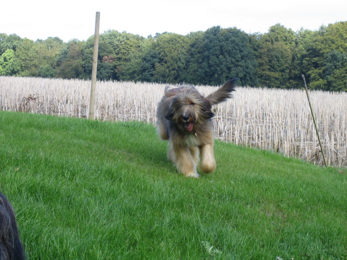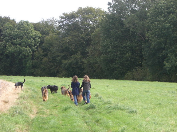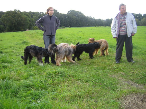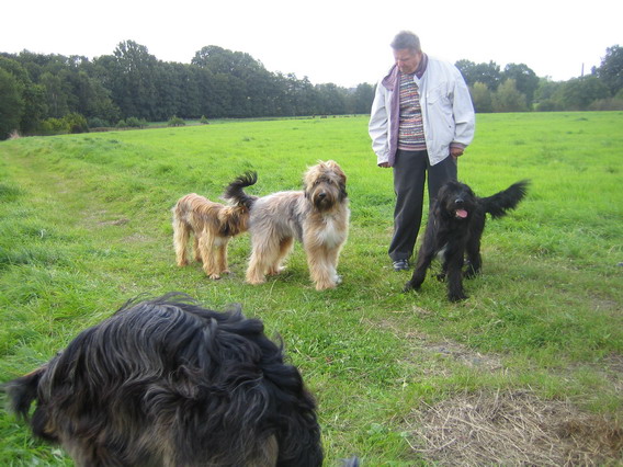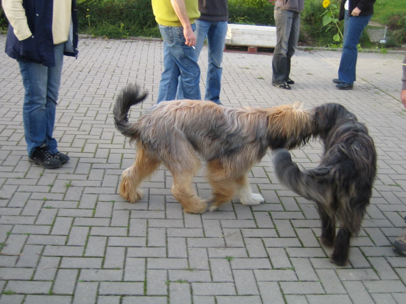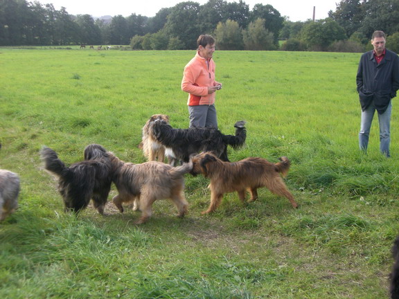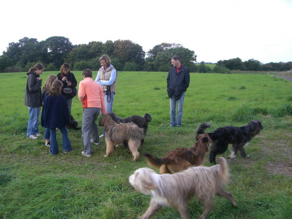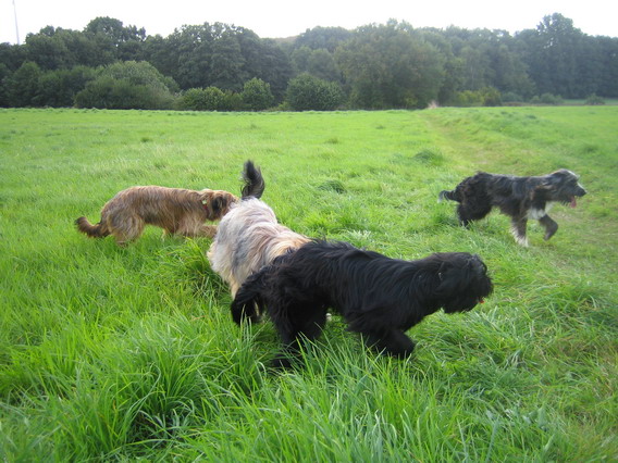Also gingen wir mit den ersten Ankömmlingen erstmal auf eine nahegelegene Wiese, auf neutrales Terrain sozusagen. Jule verhielt sich erstaunlich. Sie begegnete jedem ihrer Kinder, die nach und nach eintrudelten überaus freundlich. Mit einem souveränen Schwanzwedeln und einer Ganzkörperabnahme hieß sie ihre Kinderschar willkommen. Mir persönlich kann keiner mehr erzählen, daß Hundemütter nach einigen Monaten ihre Kinder nicht mehr wiedererkennen, ich habe das Gegenteil gesehen.
