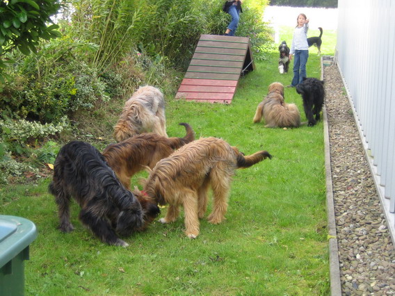 Meine Einladung stieß auf regen Zuspruch und so kamen an diesem Tag 7 von 9 ehemaligen Welpen wieder zusammen. Mit Jule und zwei anderen Fellnasen waren es dann letztendlich 10 Hunde samt ihren Steuerzahlern, die hier bei uns die Gegend unsicher gemacht haben.