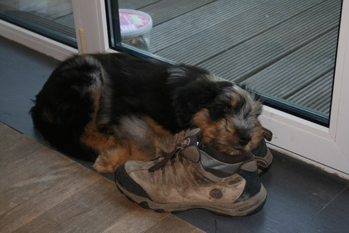 Schuhe haben oft eine sehr beruhigende Wirkung auf Welpen.